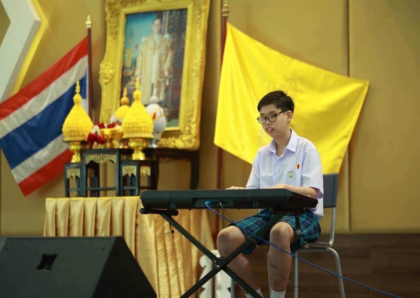 การบรรเลงเปียโนบทเพลงเกี่ยวกับในหลวงรัชกาลที่ 9 อาทิ เพลงต้นไม้ของพ่อ และบทเพลงพระราชนิพนธ์ “ยามเย็น” โดยน้องบอส ดช. ภรัณยู เหล่าผดุงรัชกร ระดับชั้น มัธยมศึกษาปีที่ 1 English Program